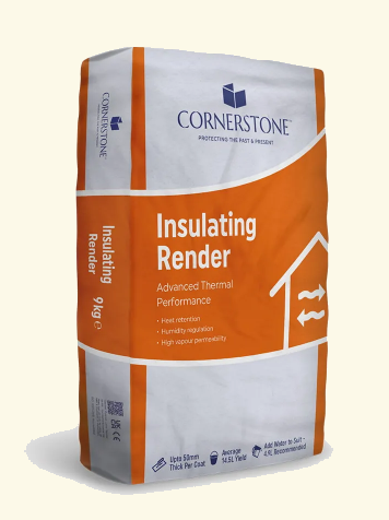 Cornerstone Insulating Render is a dry ready mixed render and plaster designed as a lightweight fibred basecoat for external applications or a basecoat and topcoat for internal applications within a minimum of a two-coat render application.